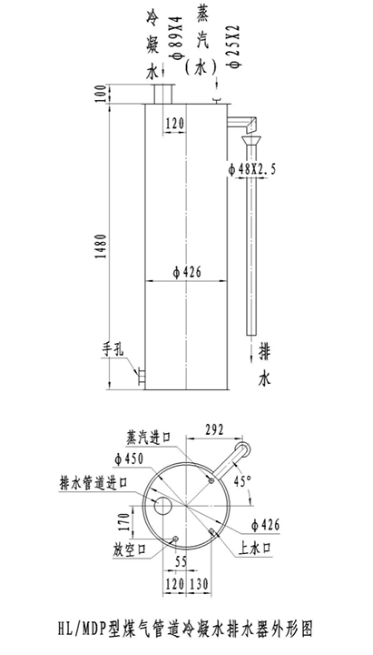 2、本設備為高壓單管排水器,排水采用雙室式水封,水封高度為3750mm,采用蒸汽保溫。